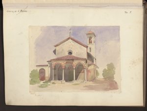 Disegno acquarellato della facciata della chiesa con il porticato dalle ghiere in cotto e gli affreschi sotto il porticato.