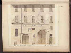 I disegni tramandati da Paravicini rappresentano la fronte di una casa sita al civico 12 di via Cappuccio, un tempo facente parte, secondo l’architetto, dello stesso cenobio di Santa Maria del Cappuccio demolita nel 1882 (BAMi, ms. S. P. II 217, quaderno 8, f. 33r; III.St.E.XIV, vol. 32, tav. XXVI). Il centro dell’isolato in cui si trovava la dimora fu sventrato sul chiudersi del XIX secolo dall’apertura di via Sant’Orsola; l’operazione comportò l’atterramento quasi completo dei monasteri femminili di Santa Maria del Cappuccio, Sant’Orsola e Santa Marta che occupavano tutta l’area meridionale dell’isolato. Poche o nulle le vestigia sopravvissute di questi complessi; per la cronologia degli sventramenti si tenga conto che nel 1895 entrarono nelle raccolte comunali parte degli affreschi del refettorio di Sant’Orsola dovuti al Maestro dei Santi Cosma e Damiano (D. Pescarmona, in Museo d’Arte Antica del Castello Sforzesco. Pinacoteca, a cura di M. T. Fiorio, II, Milano 1999, pp. 233-235; cfr. per l’autore delle pitture il recente M. Natale, C. Quattrini, Il maestro dei Santi Cosma e Damiano, con alcune proposte per Bernardino de Donati, in «Rivista archeologica dell’antica provincia e diocesi di Como», 199 (2017), pp. 33-82).