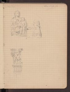 Disegni del portale della chiesa, in particolare della lunetta con i ritratti di Giovanni e Vitaliano Borromeo, realizzati il 16 agosto 1876.