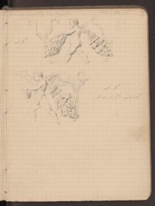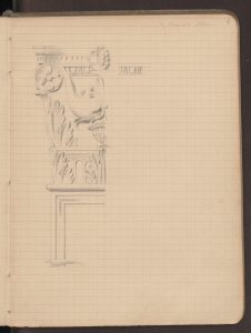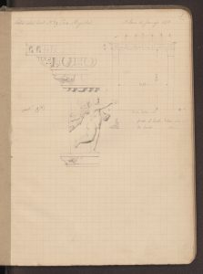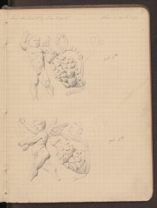 Disegni con misurazione complessiva della porta e particolare del fregio con i putti danzanti, realizzati il 14 gennaio,17 febbraio, 27 marzo, 17 aprile, 19 maggio 1872.