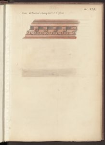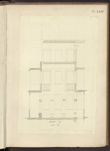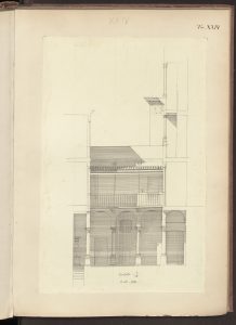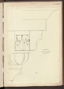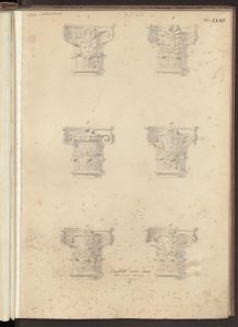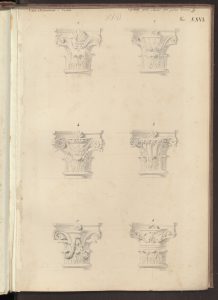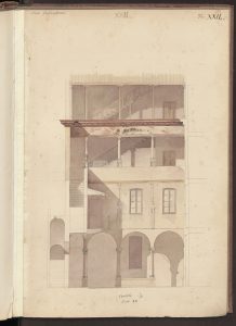 L’alzato del cortile interno di Casa Salimbeni in via Torino con particolari dei vari capitelli in Paravicini 1878, tav. 42.