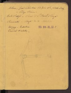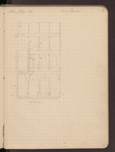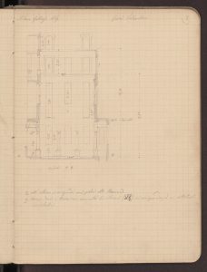 Paravicini si interessa delle preesistenze dell’edificio sito in via Torino angolo via Dogana nel febbraio 1869 (data annotata sui quaderni), l’anno in cui la struttura è demolita. L’architetto si incuriosisce dei molti eterogenei motivi architettonici presenti nello stabile senza riuscire a ricostruirne la complessa storia: da quanto recentemente ricostruito la struttura occupa infatti parte degli spazi già sede nel XIII secolo della Credenza di Sant’Ambrogio, importante organismo della Milano comunale.