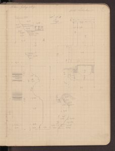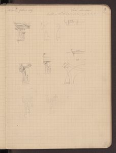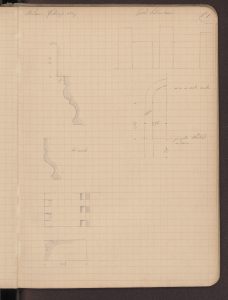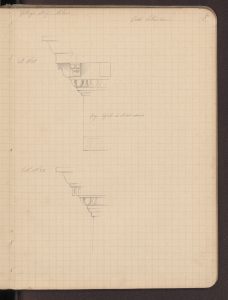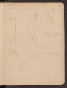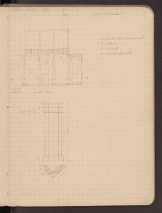 Nei suoi appunti disposti come un abecedario di termini architettonici, queste colonne «anellate» di casa Salimbeni sono testimoni di un gusto medievale che si trasmette al rinascimento e accostate a quelle del portale milanese di Santa Maria delle Grazie passando di esempio in esempio fino a quelle di Philbert De L’Orme per le Tuileries (BAMi, R 252 inf). Se Paravicini si sofferma sulla varietà dei capitelli, sulle candelabre rinascimentali, sui fregi dipinti (riproducendo efficacemente una porzione), ma anche sulla generale impostazione della fabbrica, la sua attenzione sembra attirata proprio dalle due colonne più antiche del complesso trovate murate al secondo piano nell’ala in faccia all’ingresso segnata nei quaderni con la lettera  L’architetto torna su questi elementi anche in una sorta di vocabolario architettonico “Anellata = (colonna) = durante il Medio Evo e principalmente nell’ultimo periodo artistico si usò ornare il fusto delle colonne con un anello che in moltissimi esempi è di diverso materiale di quello del gusto. Quest’uso modificato secondo il gusto ebbe una grandissima applicazione sullo stile del Risorgimento e si protrasse anche dopo. Quali fossero i primi esempi di tali genere di descrizione è difficile indagare, quello che è certo però si è che in Francia la si mette nelle invenzioni […]. Una delle forme più usitate di questi anelli nel XIV e XV secolo è quella rappresentante nella fig. A presa dalle colonne che ornavano la loggia superiore della casa Salimbeni a Milano opera del principio del XV secolo demolita” (BAMi, R 252 inf).