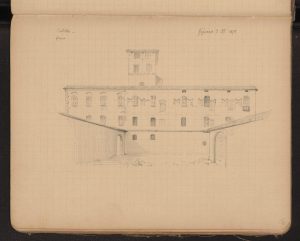 I disegni di Paravicini di Fagnano Olona sono datati 3 ottobre 1878 e rappresentano la facciata meridionale di ingresso (c. 46), un particolare dell’angolo nord-est (c. 47) e l’intera facciata orientale (c. 48). Particolare attenzione è data allo studio delle murature e alle fasi evolutive della costruzione. Sono segnalati, ad esempio, tutti i merli murati nel prospetto est che denotano l’ampliamento di un’intera ala del castello e con estremo dettaglio le aperture dello spigolo verso il fiume Olona di nord-est nelle quali Pallavicini sembra intravedere l’esistenza di un ballatoio esterno, forse un loggiato ligneo, aggettante verso il fiume. Inoltre l’architetto disegna anche la Madonna con bambino attribuita recentemente all’ambito di Jacopino da Tradate e datata tra il 1420 e il 1440 (Cavazzini 2004, pp. 106, 132, fig. 139) in pietra, uno dei pezzi più pregevoli del complesso, sottolineando che l’opera deve essere stata oggetto di un ricollocamento: «bassorilievo in pietra bigia ora collocato nella aggiunta della facciata» (c. 47).