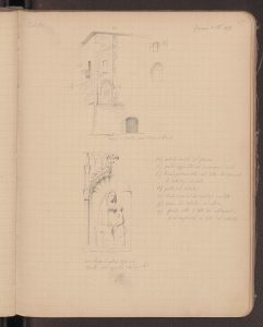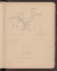 I disegni di Paravicini di Fagnano Olona sono datati 3 ottobre 1878 e rappresentano la facciata meridionale di ingresso (c. 46), un particolare dell’angolo nord-est (c. 47) e l’intera facciata orientale (c. 48). Particolare attenzione è data allo studio delle murature e alle fasi evolutive della costruzione. Sono segnalati, ad esempio, tutti i merli murati nel prospetto est che denotano l’ampliamento di un’intera ala del castello e con estremo dettaglio le aperture dello spigolo verso il fiume Olona di nord-est nelle quali Pallavicini sembra intravedere l’esistenza di un ballatoio esterno, forse un loggiato ligneo, aggettante verso il fiume. Inoltre l’architetto disegna anche la Madonna con bambino attribuita recentemente all’ambito di Jacopino da Tradate e datata tra il 1420 e il 1440 (Cavazzini 2004, pp. 106, 132, fig. 139) in pietra, uno dei pezzi più pregevoli del complesso, sottolineando che l’opera deve essere stata oggetto di un ricollocamento: «bassorilievo in pietra bigia ora collocato nella aggiunta della facciata» (c. 47).